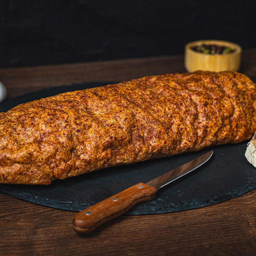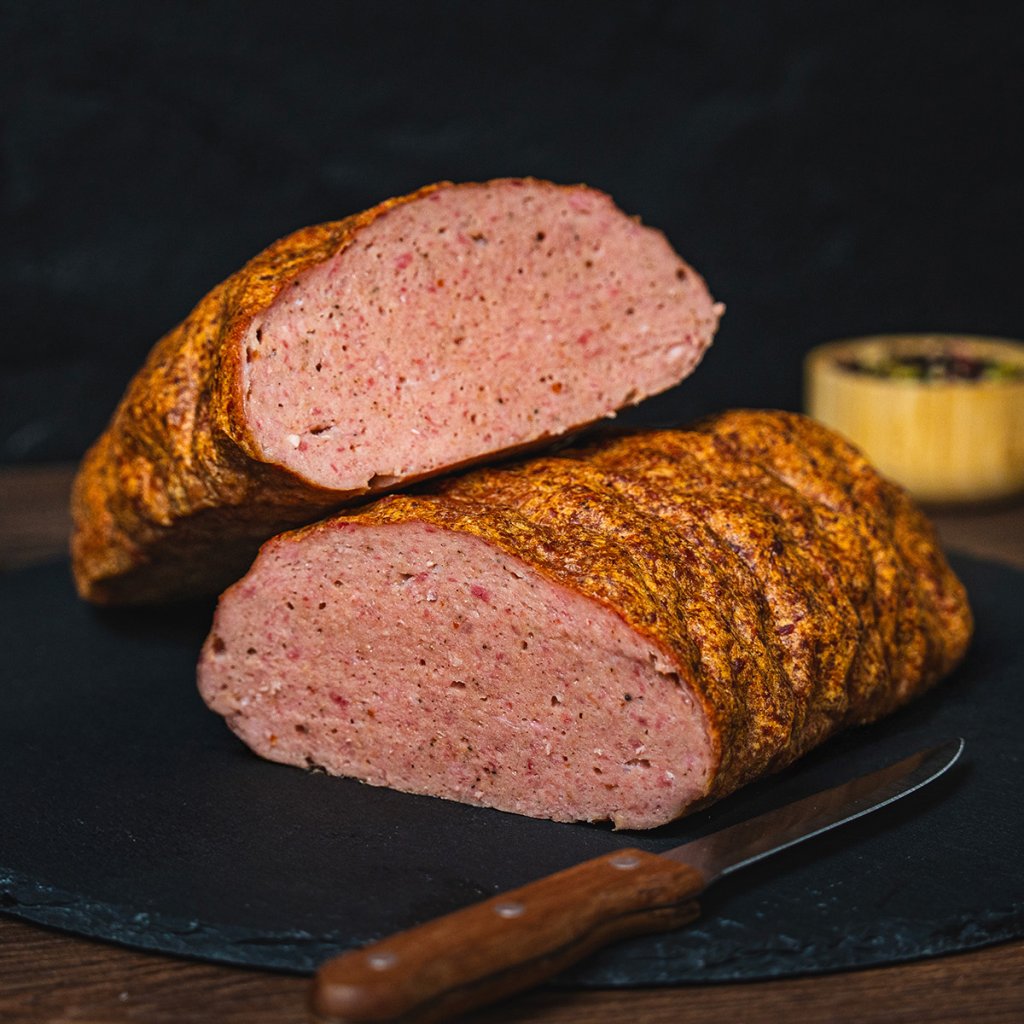| Složení: | Vepřové maso, hovězí maso, sádlo, vepřová kůže, směs koření, cibule, strouhanka, pšeničná mouka, vaječný bílek, alergeny: lepek, vejce, voda, sůl max. 3 %, konzervant E250, antioxidanty E300, E301, barvivo E160c, E162, E120, emulgátor E470, E202, E270, E331, E415, E520 |